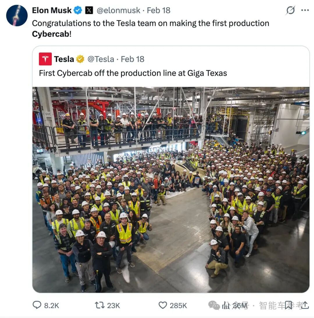 马斯克在X上发了张工厂照片,配文简单直接:"首辆Cybercab量产下线。"