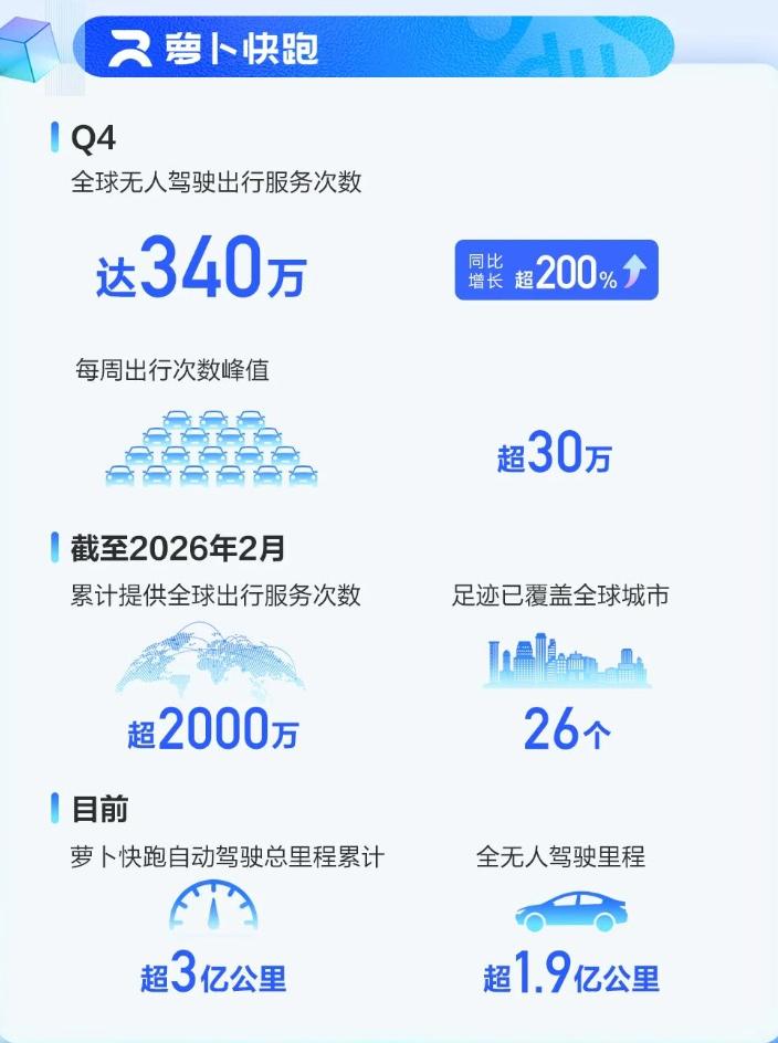 萝卜快跑是百度物理AI最直接的落地验证,其正以超预期的速度拓宽百度的想象空间。2025年四季度,萝卜快跑全球出行服务次数达340万,同比增长超200%,季度内每周出行次数峰值超30万,累计出行服务次数超2000万。