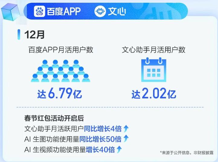 AI生产力的释放首先体现在国民级入口的进化上。文心助手凭借强大的多模态理解力,在春节红包活动的加持下,月活跃用户数实现4倍的爆发式增长,标志着AI助手从工具向高频的生活方式的转变。