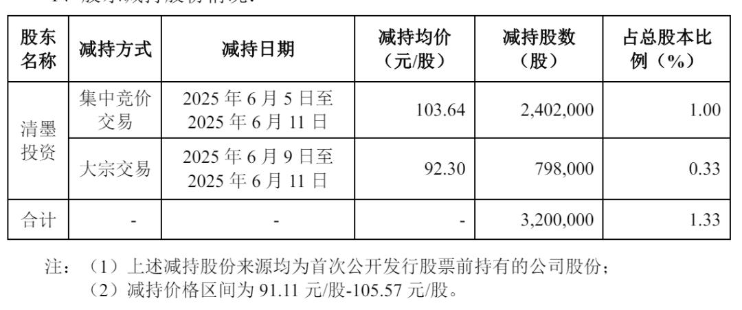 2025年6月,兆威机电披露公司股东减持清墨投资减持公司1.33%的股权,其中,通过集中竞价交易减持2,402,000股,减持均价为103.64元,套现2.49亿元;通过大宗交易减持798,000股,减持均价为92.3元,套现7366万元,一共套现高达3.23亿元。