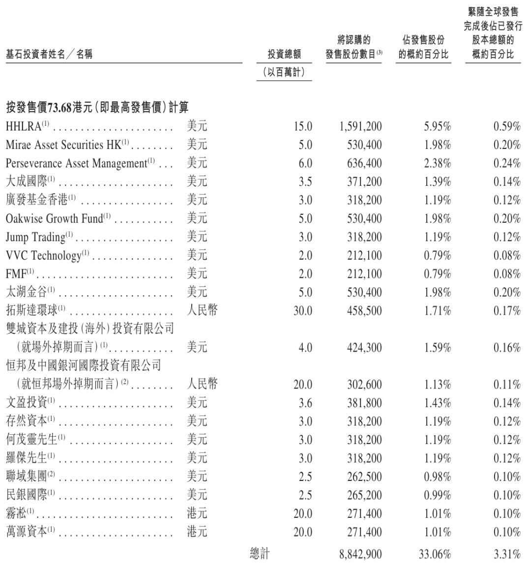 其中,HHLRA认购1500万美元,Mirae Asset Securities HK认购500万美元,Perseverance Asset Management认购600万美元,大成国际认购350万美元,广发基金香港认购300万美元,Oakwise Growth Fund认购500万美元,Jump Trading认购300万美元;