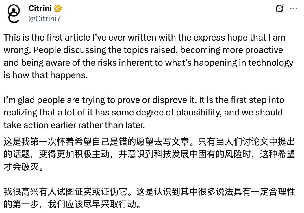 有意思的是,在Citrini报告刚发出时,创始人詹姆斯·范·吉伦就对引发股票抛售表示震惊,并坦言“希望自己是错的,很高兴有人试图证伪它”。