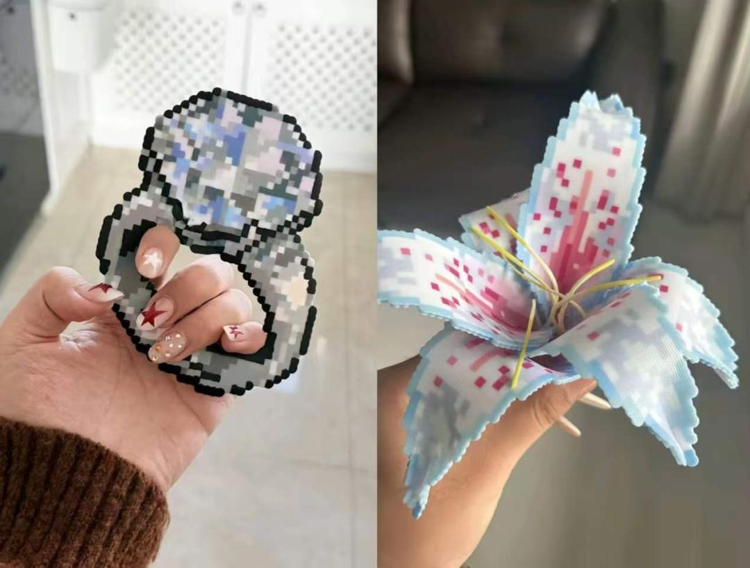 另一方面是玩法升级。普通的拼豆,用烘焙布烫一下出图,早已满足不了老拼豆家们了。他们琢磨出“毛巾烫”“闪粉烫”“植绒烫”等不同烫法,让塑料豆拥有了不同的质感。