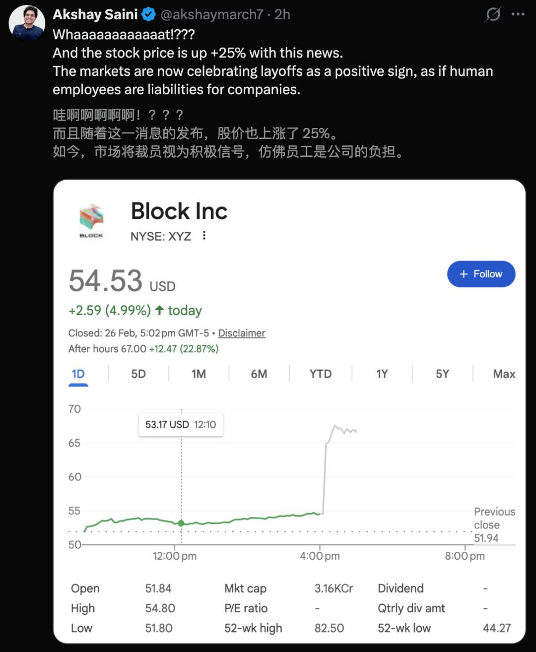 最离谱的是,对4000人痛下杀手后,Block的股价却在盘后疯狂飙升,涨幅一度超25%。