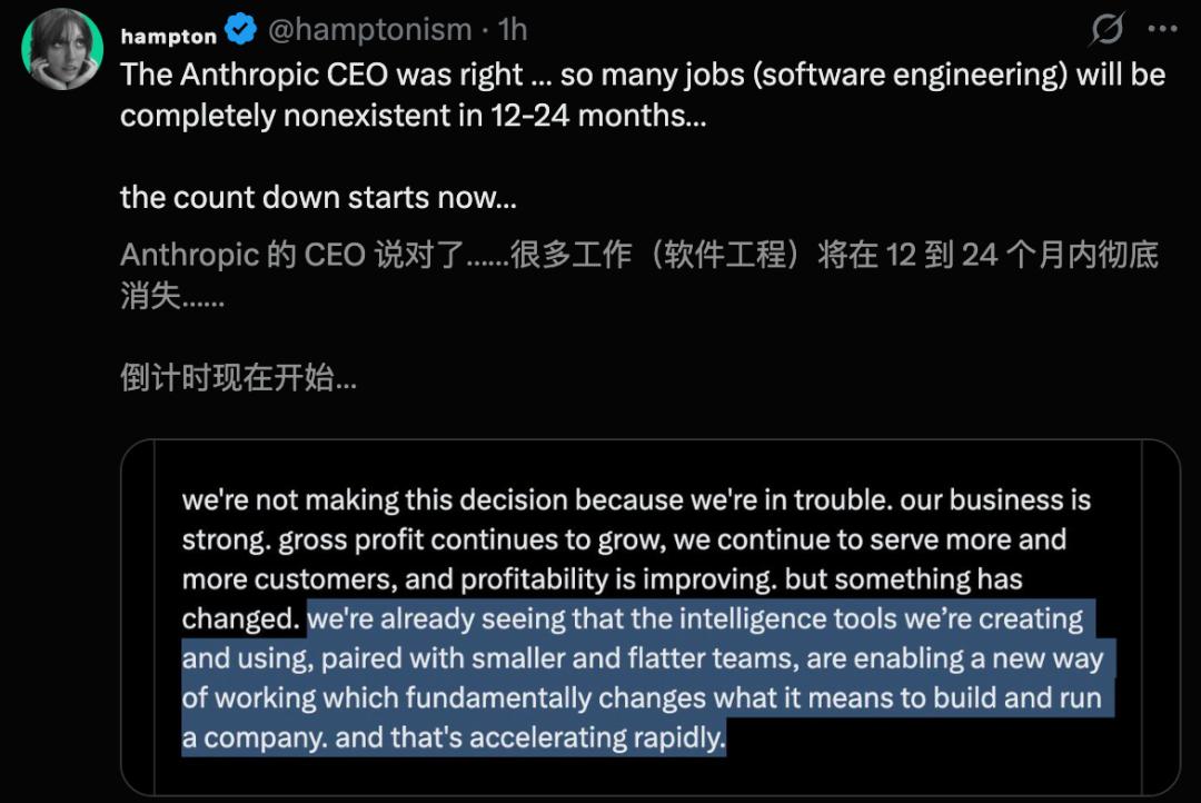 有人表示,「Dario Amodei的预言成真,码农岗消失倒计时开始」。