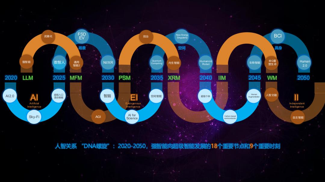 有没有相对确定的东西?我们还有一项研究,基于“2020—2050 年超级智能的 50 个问题”,构建了一张类似“人智关系 DNA 螺旋”的发展路径图,标出了强智能走向超级智能的 18 个关键节点和 9 个重要时刻。橙色代表社会与人的观念变化,蓝色代表科技周期中的关键节点。长期预测不可能完全准确,但其中有一些确定性线索。比如模型原理演进的六个阶段,这是两年多前的研究成果,已经被近两年的产业与技术发展所验证:AI 从人工智能,到具备内生能力的智能,再到自主智能的演进路径。