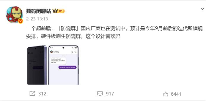 不久前@数码闲聊站爆料,国产厂商已在测试“硬件级原生防窥屏”,不出意外,今年9月前后发布的国产旗舰新机,就能率先搭载这项技术。