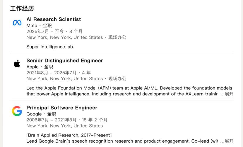 在苹果后期,庞若鸣已经是苹果AI基础模型团队的负责人。