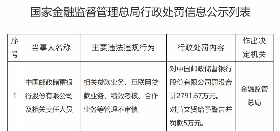 其中的9月末,因贷款业务、互联网贷款业务、绩效考核、合作业务等管理不审慎,邮储银行被罚没2791.67万元,斩获2025年最大罚单。