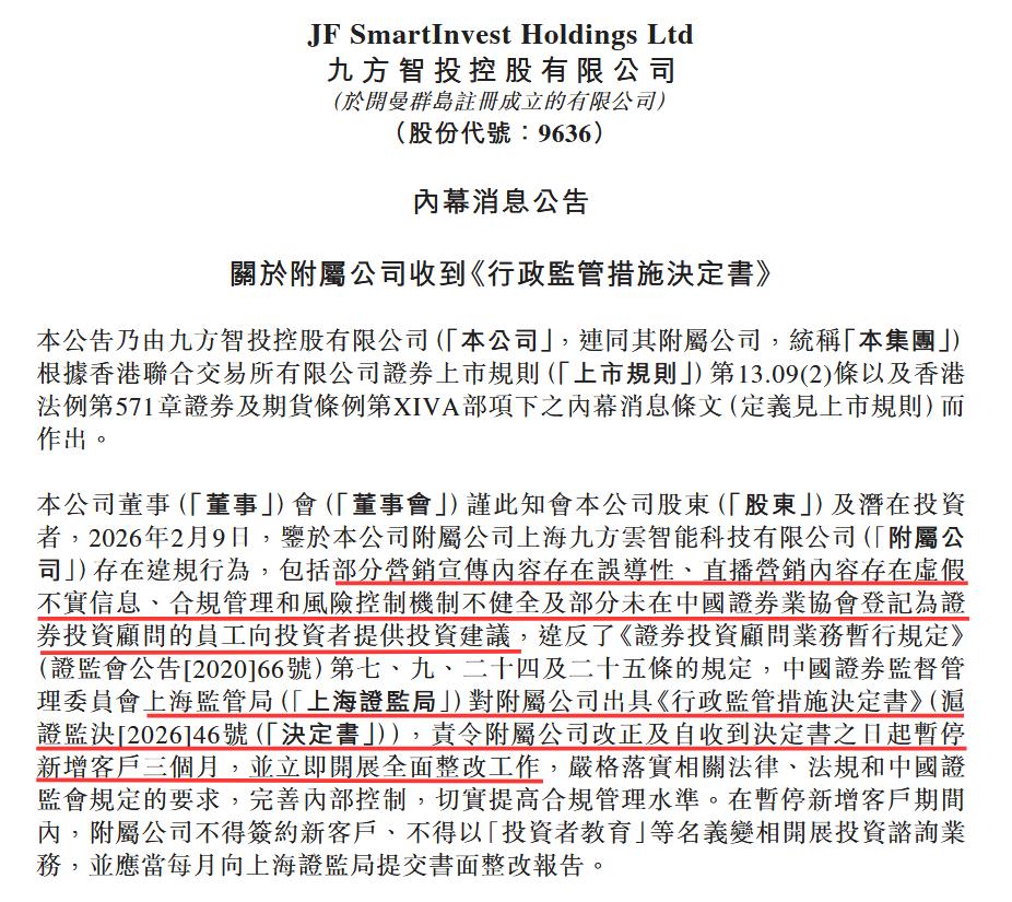 同一天,附属公司上海九方云智能科技有限公司却因营销宣传内容存在误导性、直播营销有虚假不实信息等违规行为,收到上海证监局《行政监管措施决定书》,被责令改正、暂停新增客户三个月并全面整改。