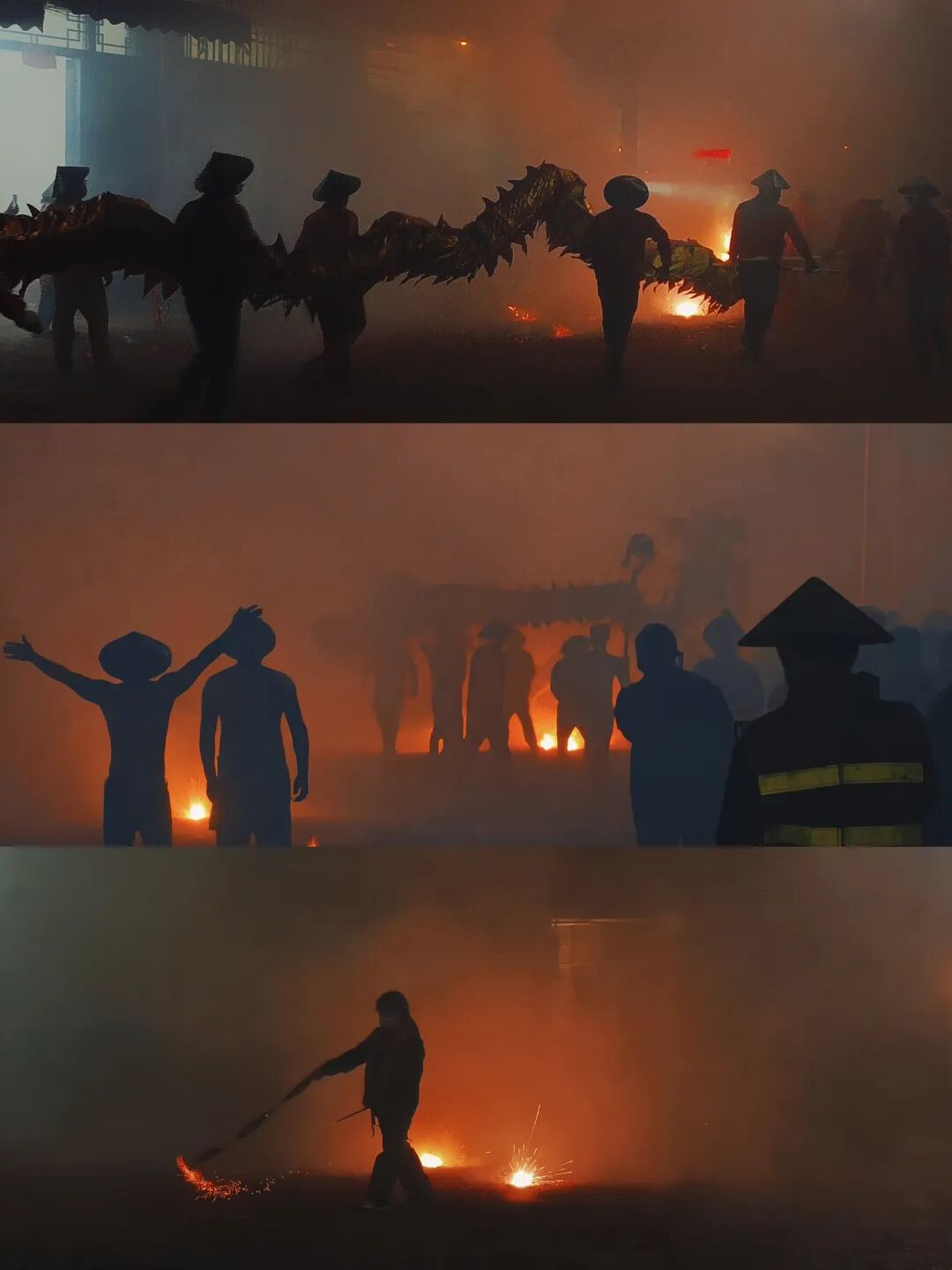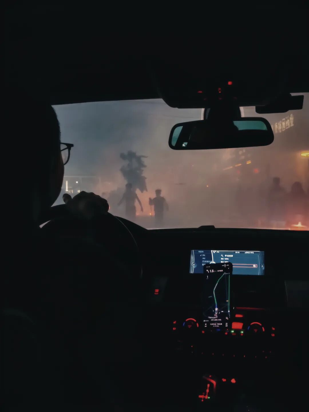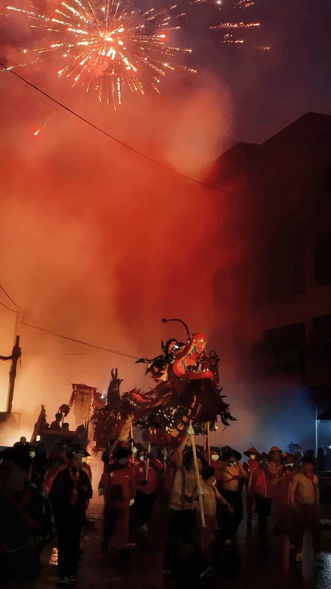 然而,令人意外的是,刚从烟雾弥漫的街道开出不远,前方又燃起了橙色的火光。本以为今晚的喧嚣已经远离的我们,竟然迎面遇上了一整支兴奋的舞龙队伍。