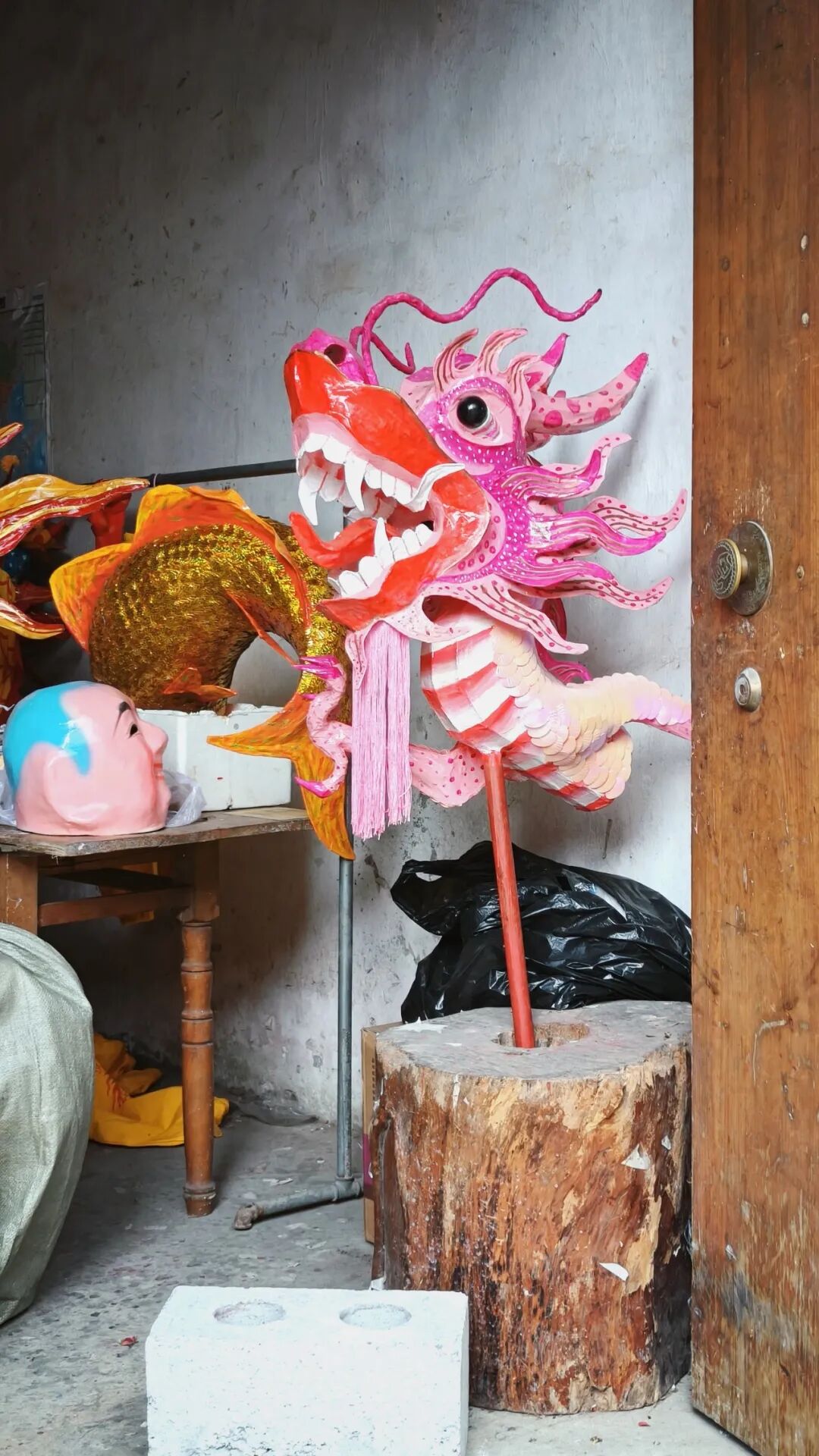 百家宴开始前,我们在白圩镇闲逛。每条街道的街口都立着各自的定制炮龙,当地人称之为“晒龙”。还未经历炮仗洗礼的炮龙栩栩如生,金色或银色的鳞片泛着庄重的光泽。