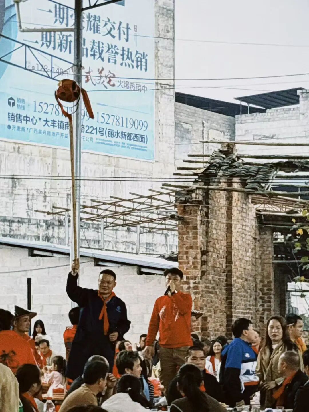 热闹的百家宴真正开始前,时间像被按下了慢速键。即将奔走一整晚的炮龙队成员们三五成群地围坐着休息聊天,一家人互相整理胸前的红布,总是成群结队出没的孩子们好奇地打量着赶来直播的网络达人。