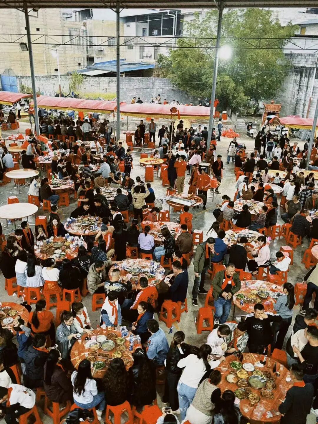 几乎每条街都会筹备自己的宴席,红色的塑料凳和大圆桌摆满整条街道,一眼望过去很是壮观。闲不住的小孩哥、小孩姐们围在宽厚的大鼓旁,敲鼓手法已然老练,但面对镜头又露出稚气的笑容。