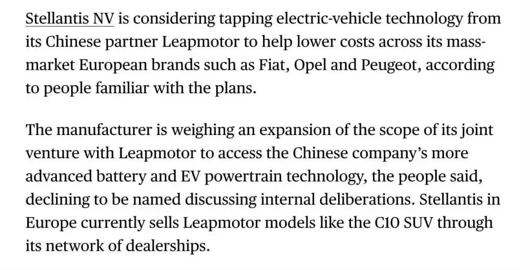 就在Stellantis发布财报的同一天,彭博社曝出一则消息,Stellantis正考虑扩大与零跑汽车的合资范围,采用这家中国合作伙伴的电池和电驱动技术,降低菲亚特、欧宝和标致等欧洲主流品牌的开发成本。