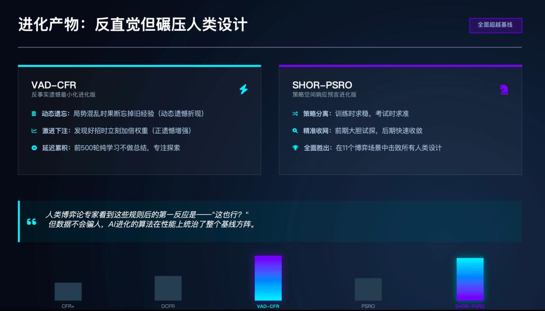 第一套叫VAD-CFR,它学会了三件人类教练从来没想过的事:局势混乱时果断忘掉旧经验,发现好招时立刻加倍下注,前500轮纯学习不做总结。 听起来很奇怪对吧?但它就是比所有人类设计的方法都好用。
