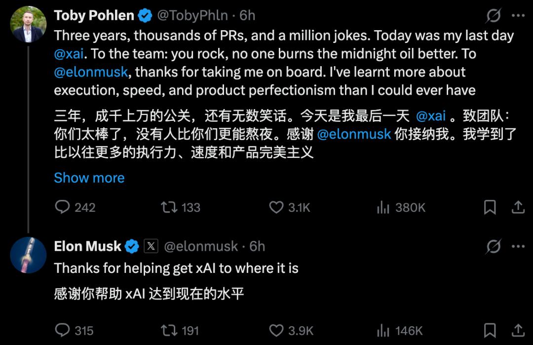 可以看到,在不少离职人士的官宣推文中,都提到感谢马斯克、感谢xAI,并肯定了马斯克在构建公司上的举措。