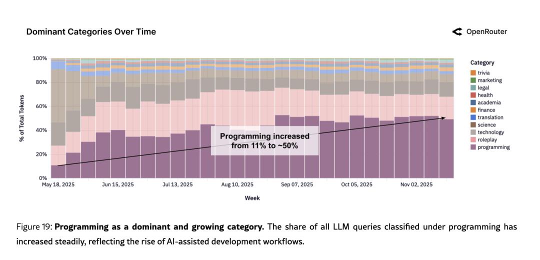 OpenRouter与a16z联合发布的《2025 AI使用报告》,覆盖超100万亿Token的匿名元数据。里面有一组数据极其关键——编程任务的Token占比从2025年初的11%飙到了50%以上,成为平台最大的单一使用品类。同时,Agent驱动的工作流(模型自主执行多步骤任务)产生的输出Token已超过平台总输出的一半。