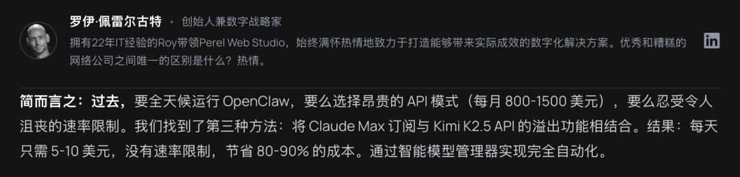 一家使用OpenClaw的欧洲开发工作室公开了他们的方案:80%的日常推理引擎用Kimi K2.5,碰到高难度推理、复杂系统架构之类的20%硬骨头,通过bash命令把任务甩给Claude。一天的Kimi开销大约5到10美元,月度Token预算控制在150到300美元。如果同样的事全量用ClaudeAPI模式,月成本将高达800-1500美元以上。