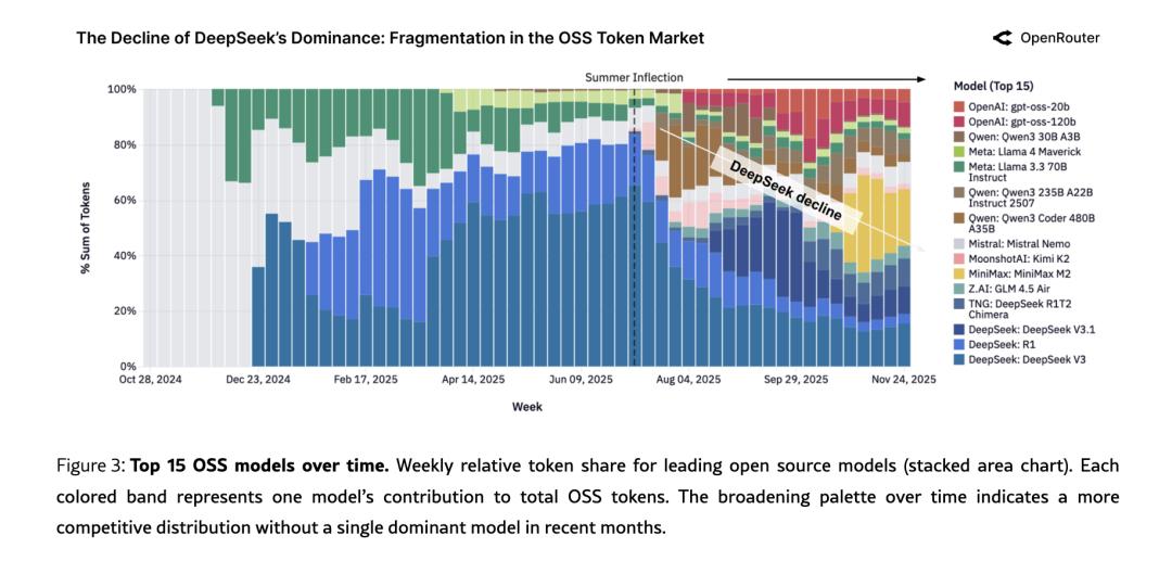 图:2024年末DeepSeek V3和R1占了一半以上(深蓝色),2025年中之后色块急剧多样化,Qwen、MiniMax、Kimi、GPT-OSS等轮番上位,没有单一模型超过25%。