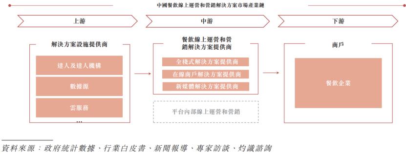 中国餐饮在线运营和营销解决方案行业上游包括达人或达人机构、技术服务商、流量平台,参与者有美团、饿了么、大众点评、微信、抖音、小红书、高德地图等。