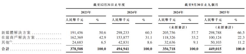 具体来看,2023年至2025年1-9月(简称“报告期”),再惠来自新媒体解决方案的收入占比从50.6%提升至66.5%,在线商户解决方案的收入占比从42.9%降至22.3%,另外还有小部分收入来自经营自营餐厅。