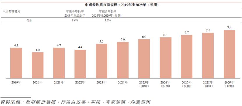 其中,餐饮业从业人员超过2000万人,2024年中国餐饮业创造了5.6万亿元收入,占本地商户服务行业总收入的40.6%。预计2029年中国餐饮业规模将达到7.4万亿元,2024年至2029年的年复合增长率为5.7%。