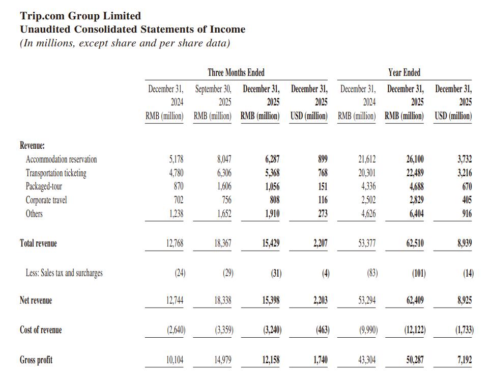 财报显示,携程2025年全年营收624亿元,同比增长17%;净利润达到334亿元。源自海外投资收益的199亿元,对利润增幅产生了较大贡献。若剔除相关影响,利润的增长曲线将更接近收入端的节奏。