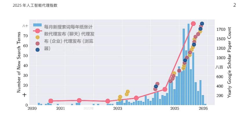 (蓝色柱状图代表与代理型人工智能产品相关的谷歌新增搜索词,红线则代表谷歌学术中包含“人工智能代理”或“代理型人工智能”关键词的论文发表数量)