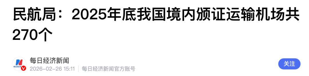 日前,民航局发布的《2025年全国民用运输机场生产统计公报》显示,截至2025年底,我国境内颁证运输机场共270个(不含港澳台地区)。