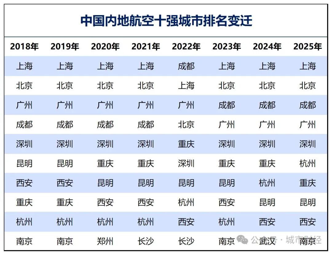 从头部航空枢纽格局看,近年来的主要变化可概括为:成都反超广州,跻身前三;重庆、深圳、杭州围绕“航空第五城”展开角逐;西安、昆明排名有所下滑;武汉、南京争夺十强席位。