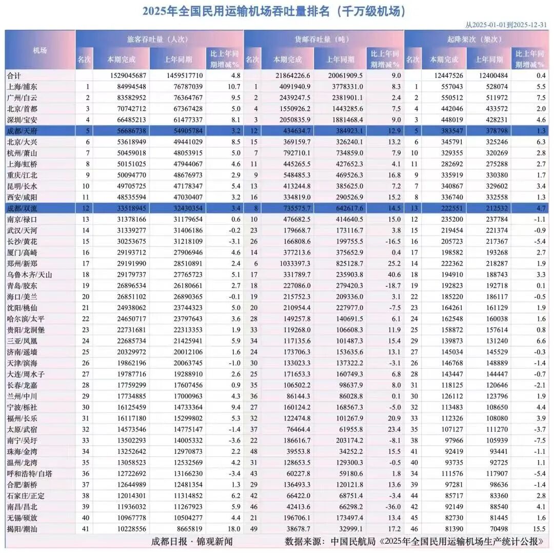 而自西安咸阳开始,差距拉大。排名其后的成都双流机场2025年吞吐量仅3300万人次——此前双流机场曾一度突破5000万,长期位列全国第四,后因天府机场分流才出现变化。