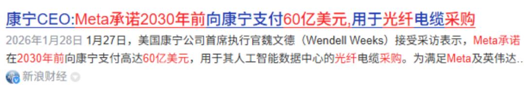 例如,Meta已承诺2030年前花费60亿美元向康宁采购光纤。这个订单金额超过了2024年康宁与Lumen的50亿美元订单,几乎等同于2025年康宁光通信业务全年营收。