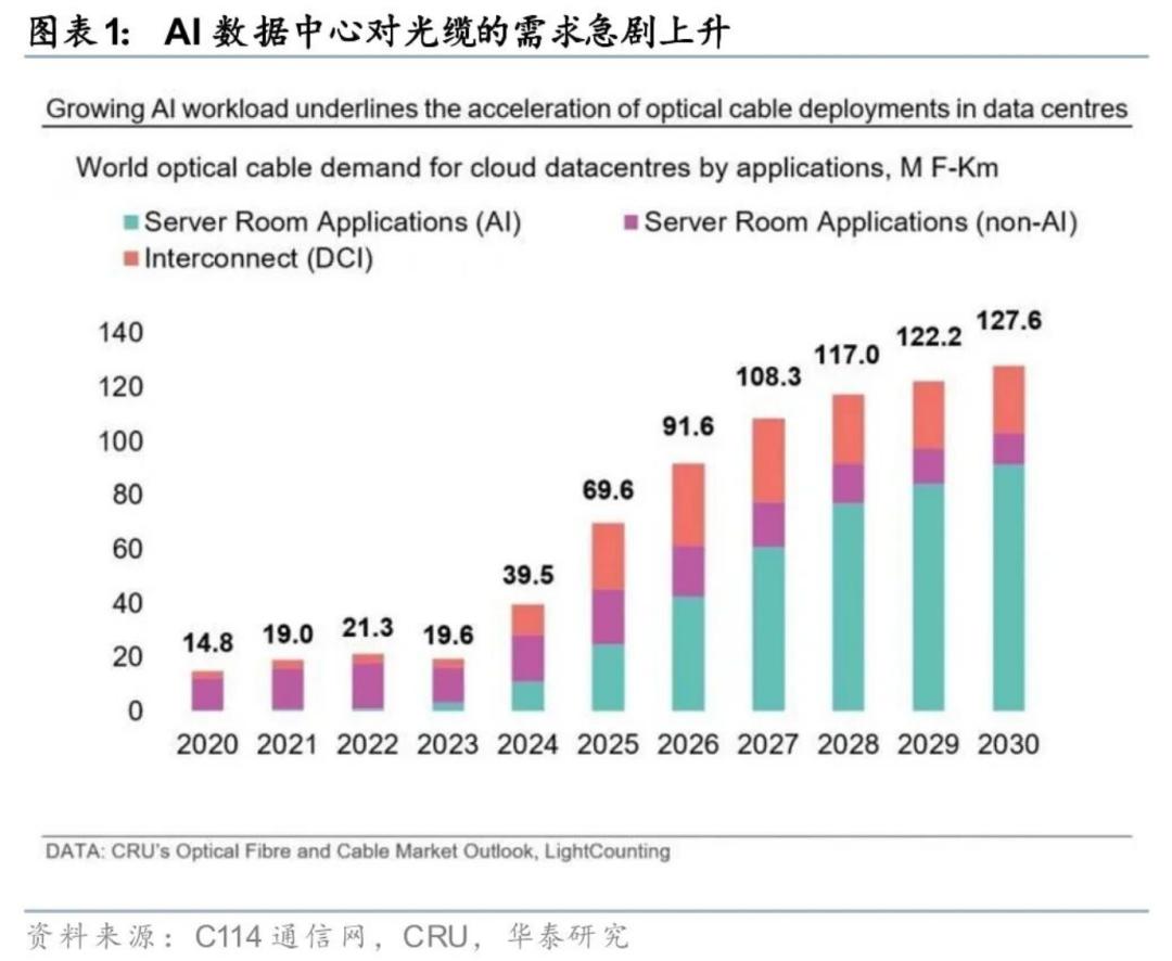 北美主要供应商(康宁、普睿司曼、藤仓、古河)的产能利用率已处于高位,且扩产缓慢(如藤仓新产能2028年后才能释放)。于是,从2025年下半年开始,需求向全球市场传导,影响到了我们国内。