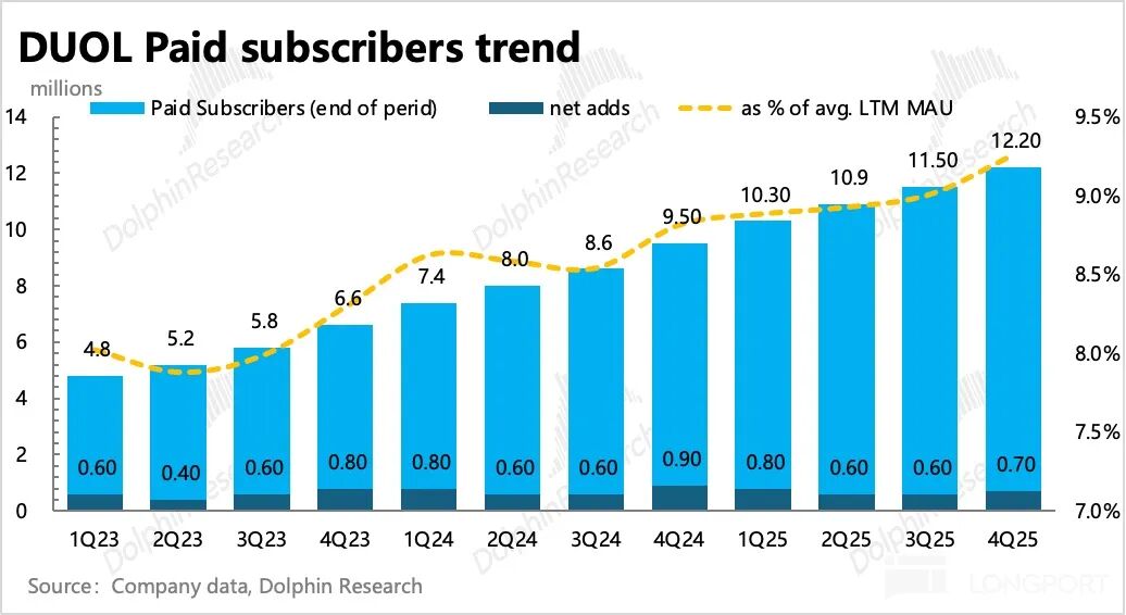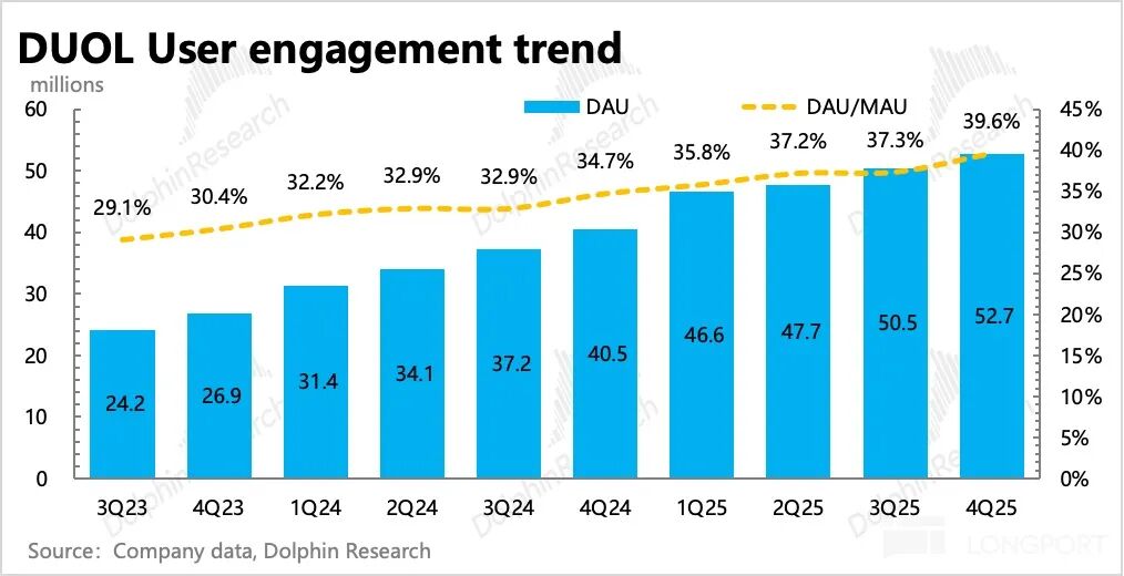 管理层最关注的用户指标,四季度月活达到 1.33 亿,日活 5270 万,日活增速 30%,环比继续放缓。Sensor Tower 数据显示,12 月 DAU 增速下降到了 26%,1 月继续放缓至 22%,引发了年初以来股价的持续调整。
