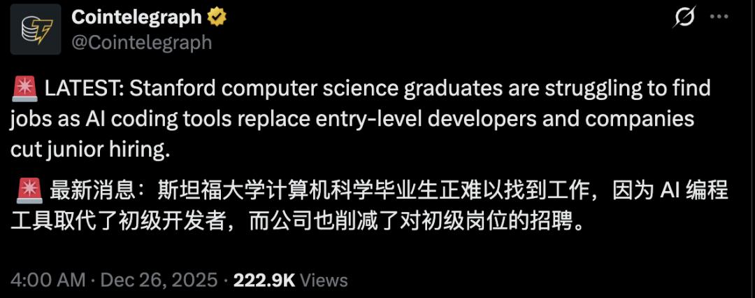哈佛大学一项覆盖了6200万劳动者的研究,数据显示:当一家公司开始用生成式AI,六个季度之内,初级开发者的岗位需求会应声下跌9%到10%。