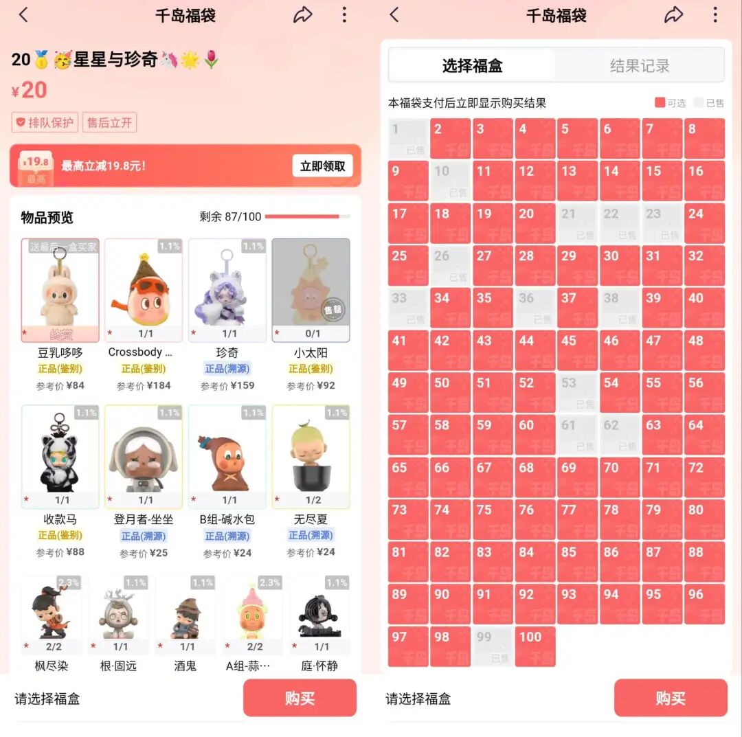 但据一位千岛前员工介绍,相比于确定性的二手交易,千岛更赚钱的其实是“福袋”业务。是指卖家把不同的玩具放在一个链接里让消费者盲抽,通常用户为了热门款,想要以小搏大,极大地增加了交易频次和单次交易金额。