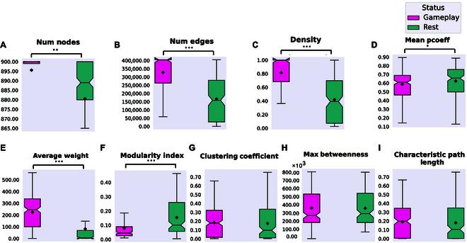 比较每次录制的前2分钟和最后2分钟,游戏状态下的网络在边数、密度、平均权重和模块化指数等多项指标上都出现了统计学显著的变化,而静息状态下这些指标没有显著差异。