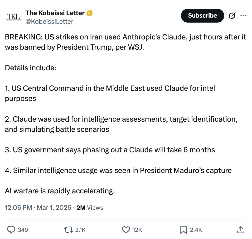 然而,据华尔街日报报道,在美国宣布联邦政府将停止使用Anthropic的AI工具几个小时后,特朗普就利用这些工具对伊朗发动了一次大规模空袭。3月1日,伊朗政府确认哈梅内伊遇袭身亡,引发外界联想是否已有AI参与。知情人士证实,包括美国中央司令部在内的世界各地指挥机构都都在使用Claude,用于情报评估、目标识别和模拟作战等场景。