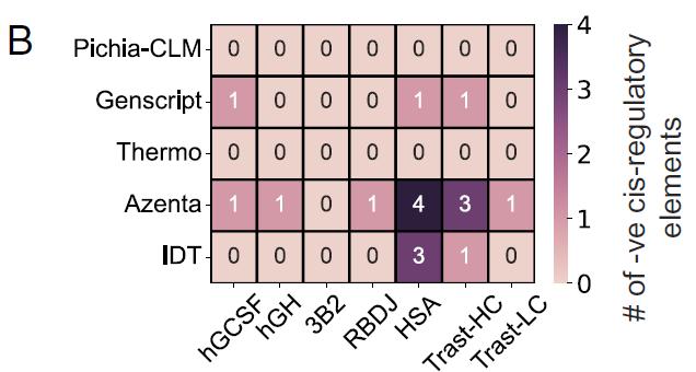 在 6 种测试蛋白中,采用 Pichia-CLM 设计的构建体均未检测到负向顺式调控元件;相比之下,GenScript 在 6 种蛋白中有 3 种包含 1 个负向顺式调控元件;Azenta 和 IDT 在至少一种蛋白中产生了含有 3 至 4 个此类元件的序列,如下图 B: