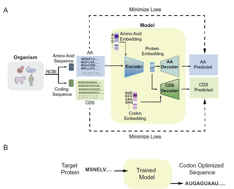 模型以蛋白质的氨基酸序列作为输入,并根据从宿主氨基酸序列和编码序列中学习到的模式生成相应的 DNA 序列,整体架构如下图所示:
