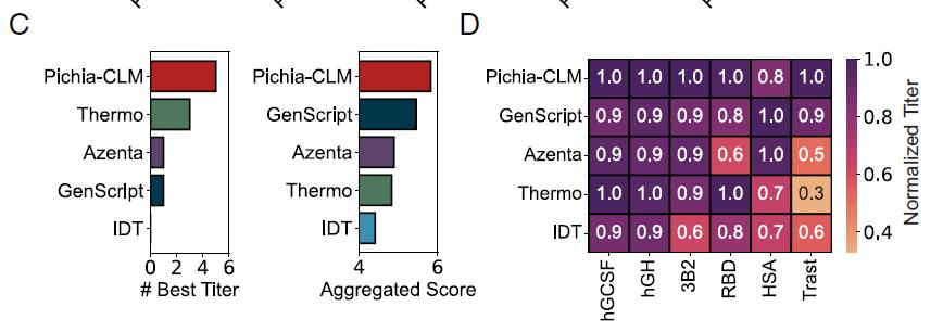 总体来看,Pichia-CLM 在这两个指标上均优于商业算法(如下图 C);它在 6 种蛋白中有 5 种取得最高滴度,仅在 HSA 上因滴度略低而导致综合得分略微下降(约 0.2)(如下图D)。