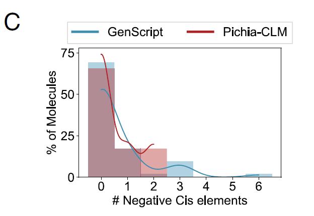 研究人员也分析了 Pichia-CLM 在 52 种生物技术相关蛋白中的表现,结果显示:75% 的蛋白序列完全不含负向顺式调控元件,剩余 25% 最多仅含 2 个此类元件。相比之下,表现最好的商业算法 GenScript 在约 15% 的蛋白中仍产生了含 3 至 6 个负向顺式调控元件的构建体,如下图 C: