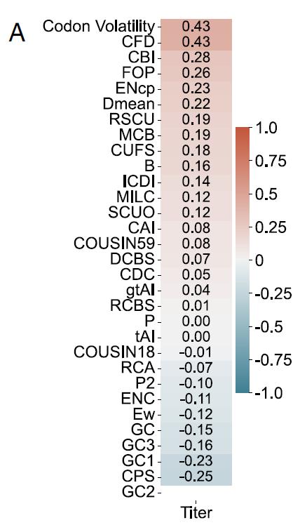 结果表明,这些指标均未能在不同蛋白之间与产量表现出一致且较高的相关性。例如,在 HSA 的情况下(如下图 A),与密码子波动性和密码子频率分布(CFD)的最大正相关仅为 0.43,而与密码子对评分(CPS)的最大负相关也仅为 0.25。