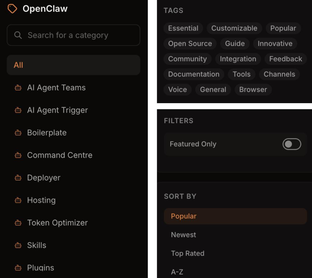 AI Agent Teams(Agent团队协同工作方案)、AI Agent Trigger(触发Agent执行任务的机制/工具)、Boilerplate(代码模板)、Command Centre(控制面板)、Deployer(部署工具)、Hosting(托管服务)、Token Optimizer(Token优化工具)、Skills(扩展特定功能的技能模块)、Plugins(增强OpenClaw能力的插件)。