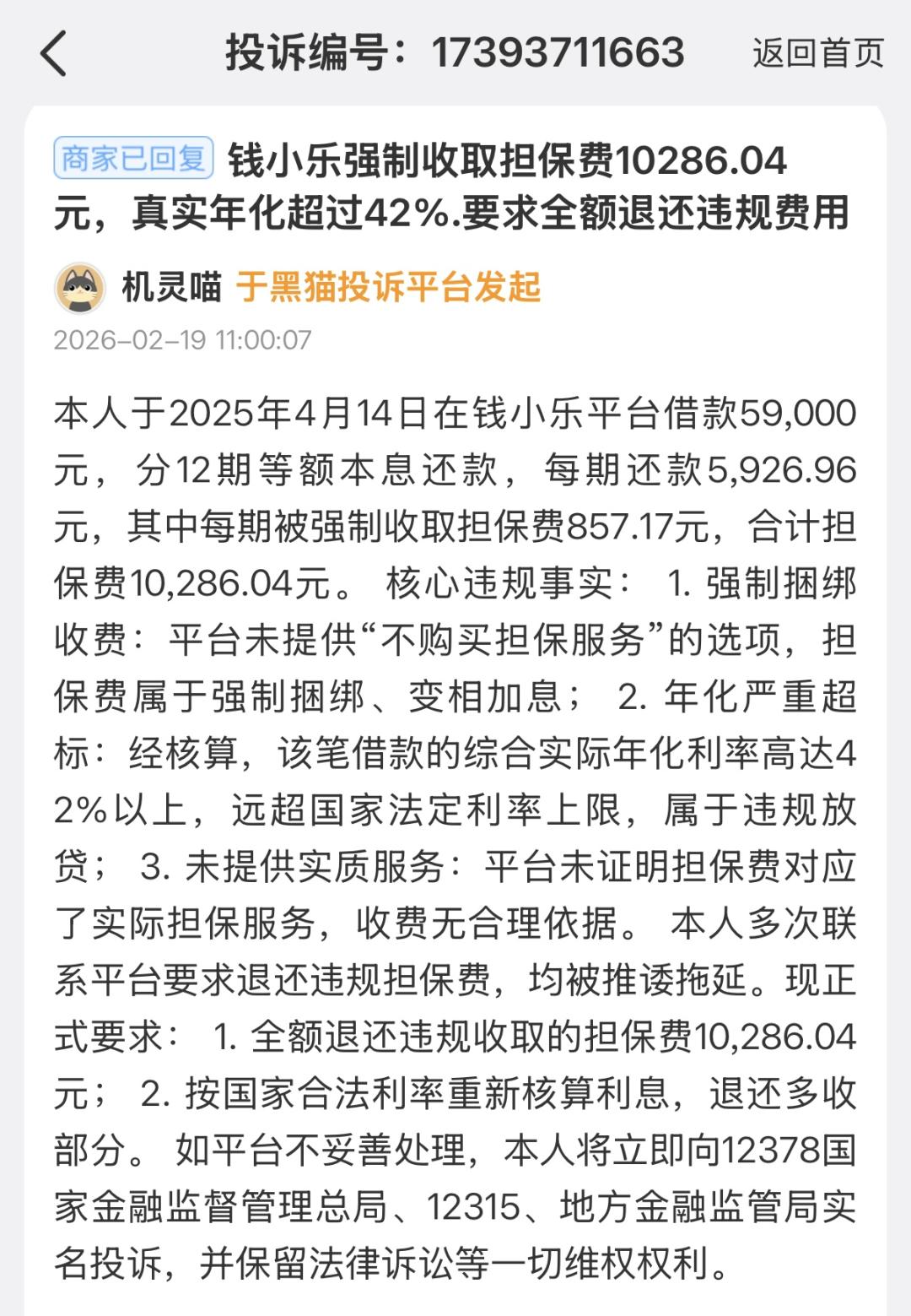 自百融云创上市之初,关于榕树贷款的投诉量居高不下。截至2026年3月1日,仅黑猫投诉平台就堆积了3326条投诉,内容集中于实际贷款利率过高,侵犯个人隐私等问题。有用户反映,通过钱小乐借款59000元,被强制收取担保费合计10286.04元,经核算,实际年化利率高达42%以上。
