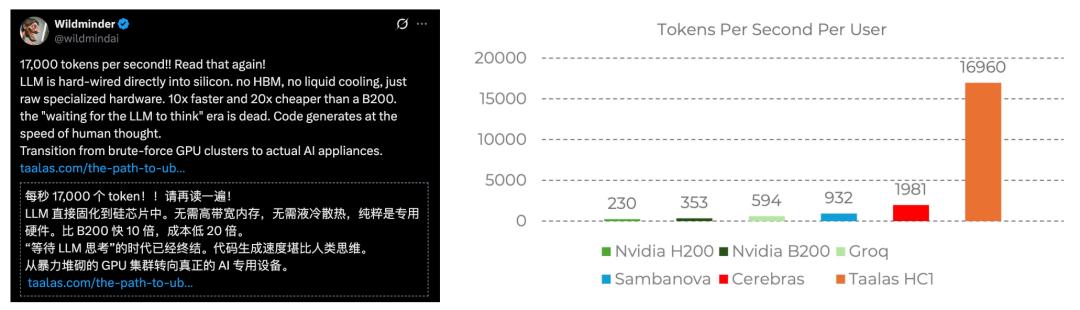 芯片运行Llama 3.1 8B的速度达到了17,000tokens/秒。
