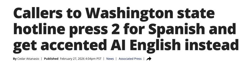 有人发现,拨打美国华盛顿州车辆管理局 (DOL) 的热线电话,如果按“2”选择了西班牙语,听到的不是西班牙语,而是AI用西班牙口音讲英语……