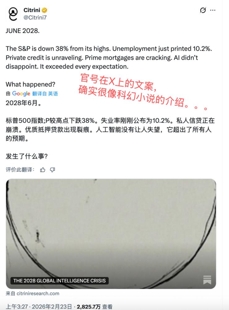 一家小型机构Citrini Research发布了一篇名为《2028年全球智能危机》的报告。