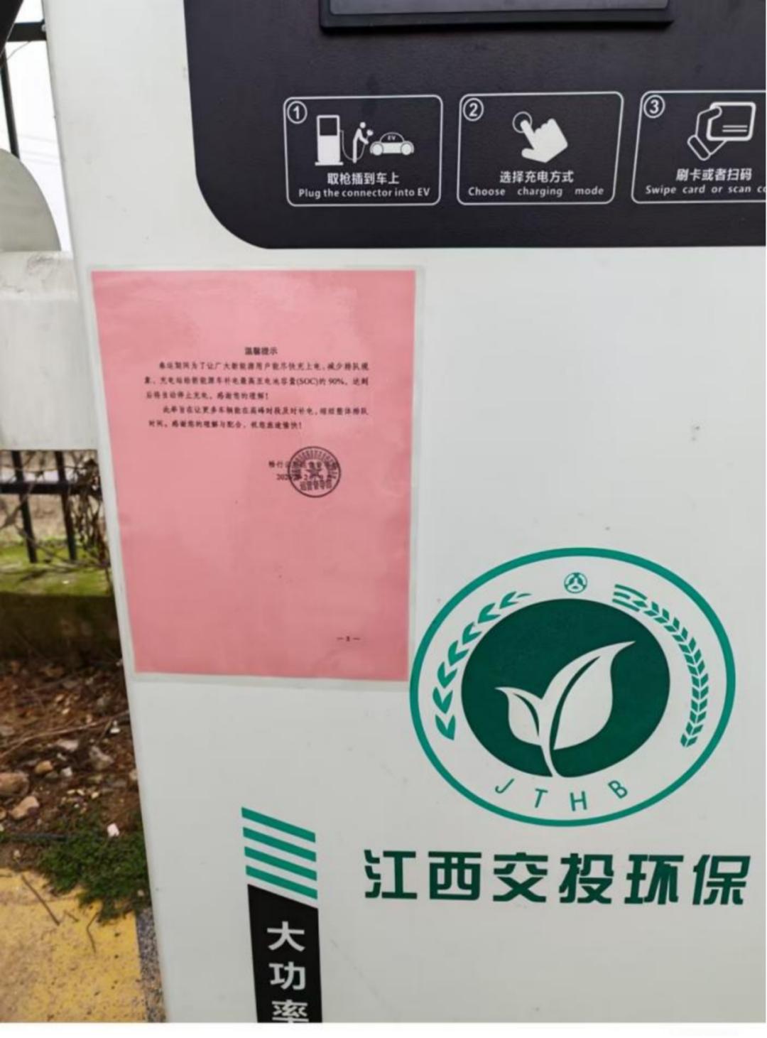 但在有人管理和在终端有限制的充电站,情况就会好很多。比如金溪服务区专门在充电桩上贴有“温馨提示”,为了让广大新能源用户能尽快上电、减少排队现象,充电达到电池容量的90%后,将自动停止充电。